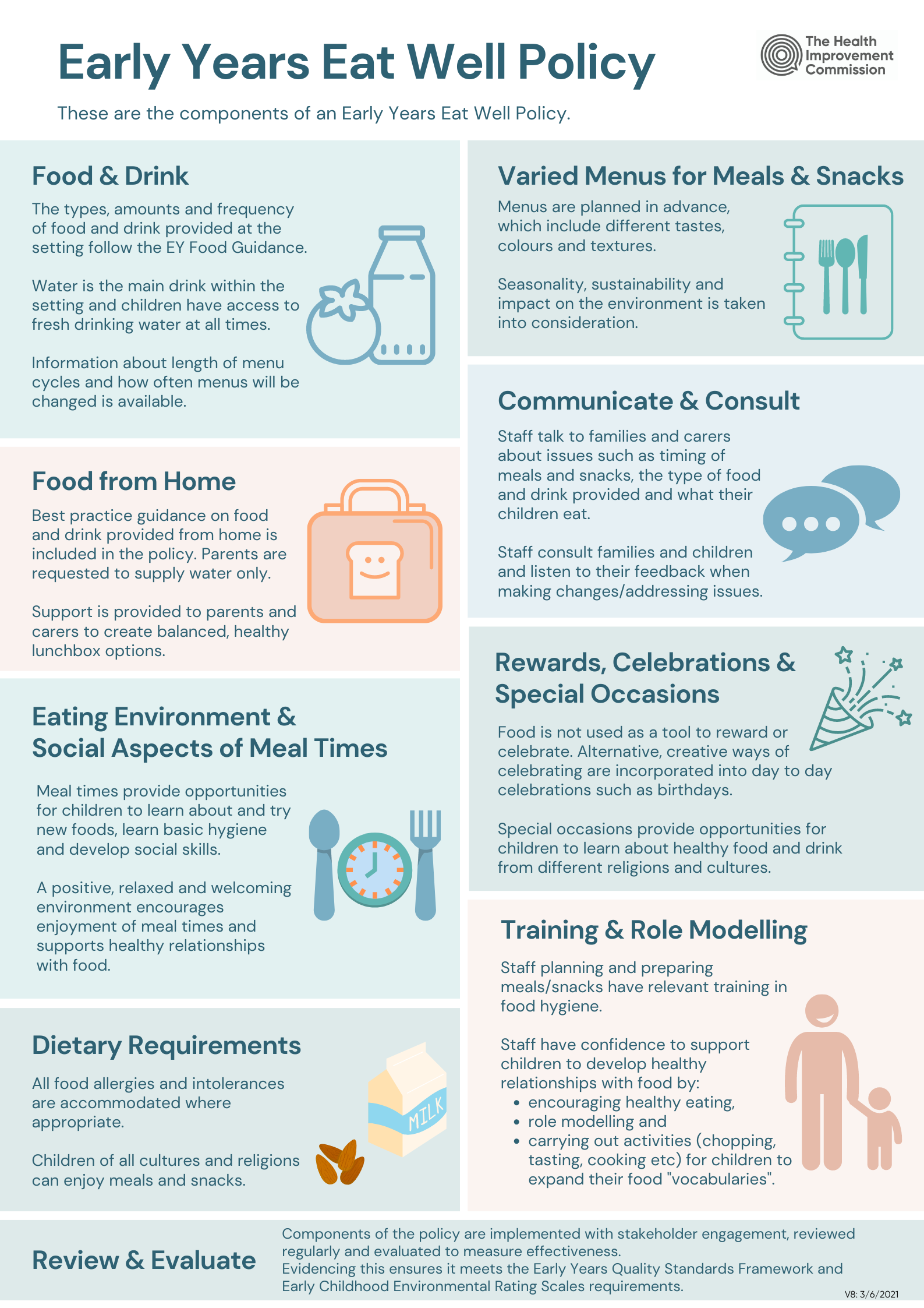 The policy is based on the latest evidence and includes 8 elements which support pre-school age children to develop a healthy relationship with food including eating in social environments, avoiding using food as a reward, healthy lunch box guidance and working closely with parents and carers. The different elements of the policy can be seen below.