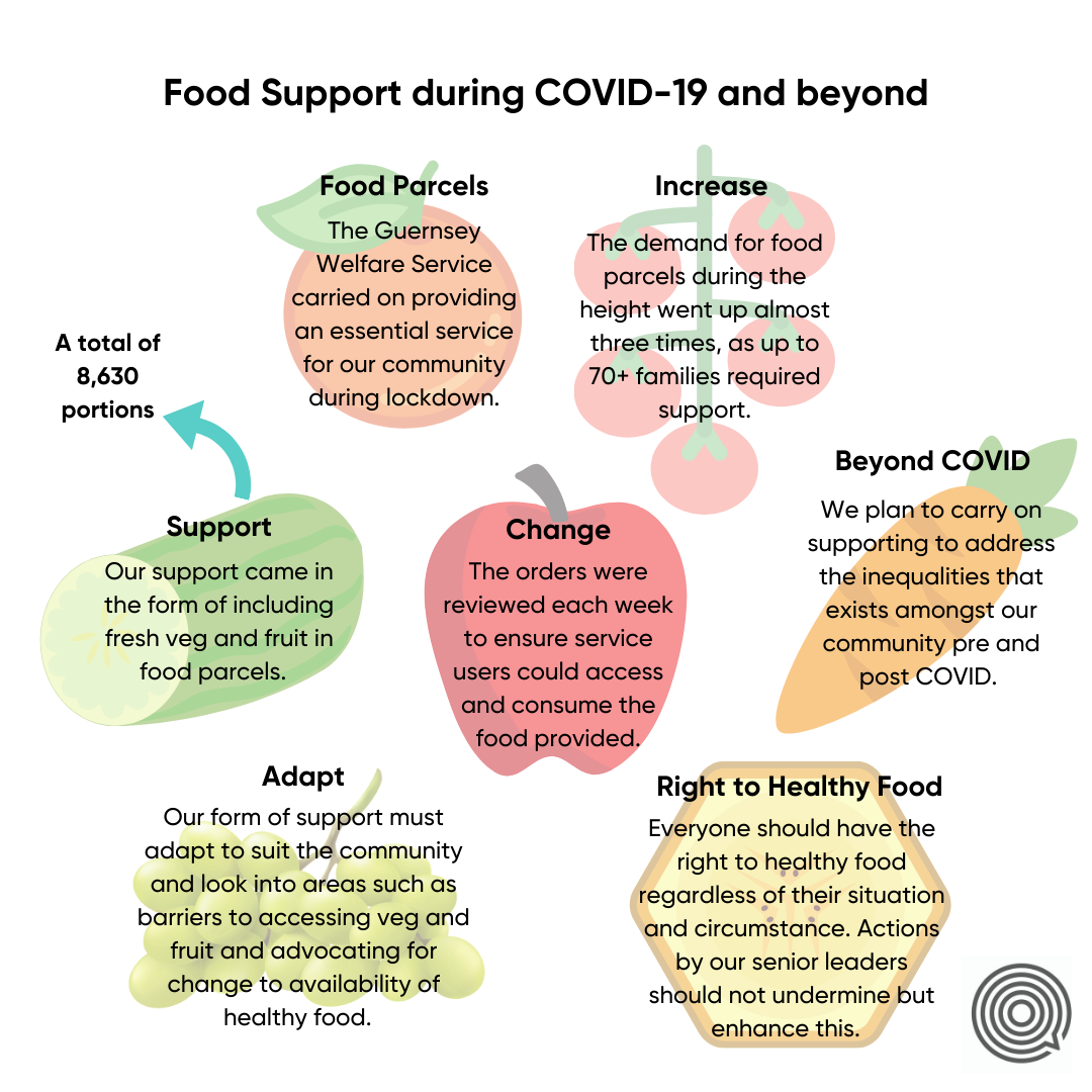 During lockdown we looked to adapt our support and reach out to those most in need. Initial concerns were raised when pressure was put on families and individuals to access healthy food, thus, we wanted to support services that provide essential food support. Due to COVID related restrictions imposed, the Guernsey Welfare Service had a drop in fresh fruit and veg and subsequently their foodbank suffered. Over a period of 14 weeks, we supplemented nearly 1000 Guernsey Welfare Service Food Bank parcels with approximately 8,630 adult portions of fresh vegetables and fruit since March. Phase 5 has seen the foodbank re-open, therefore, we’re looking to extend our support in other forms to ensure people have access to healthy food.
