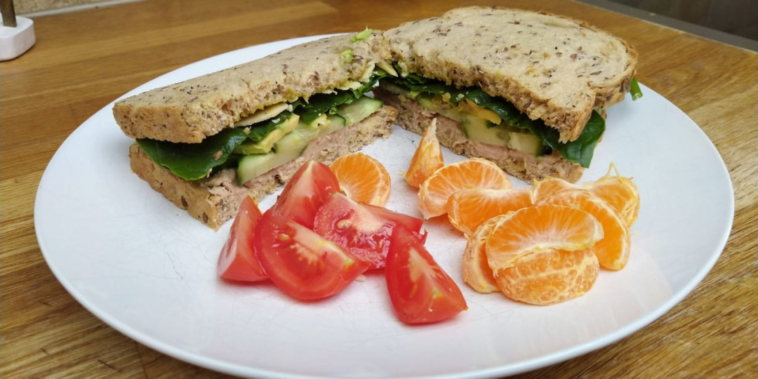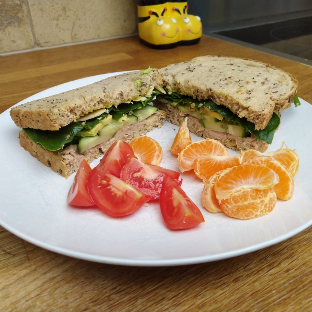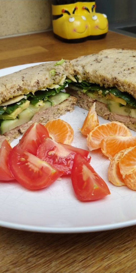 Cucumber, avocado, spinach and cheese sandwiches with a side of tomatoes and mandarins