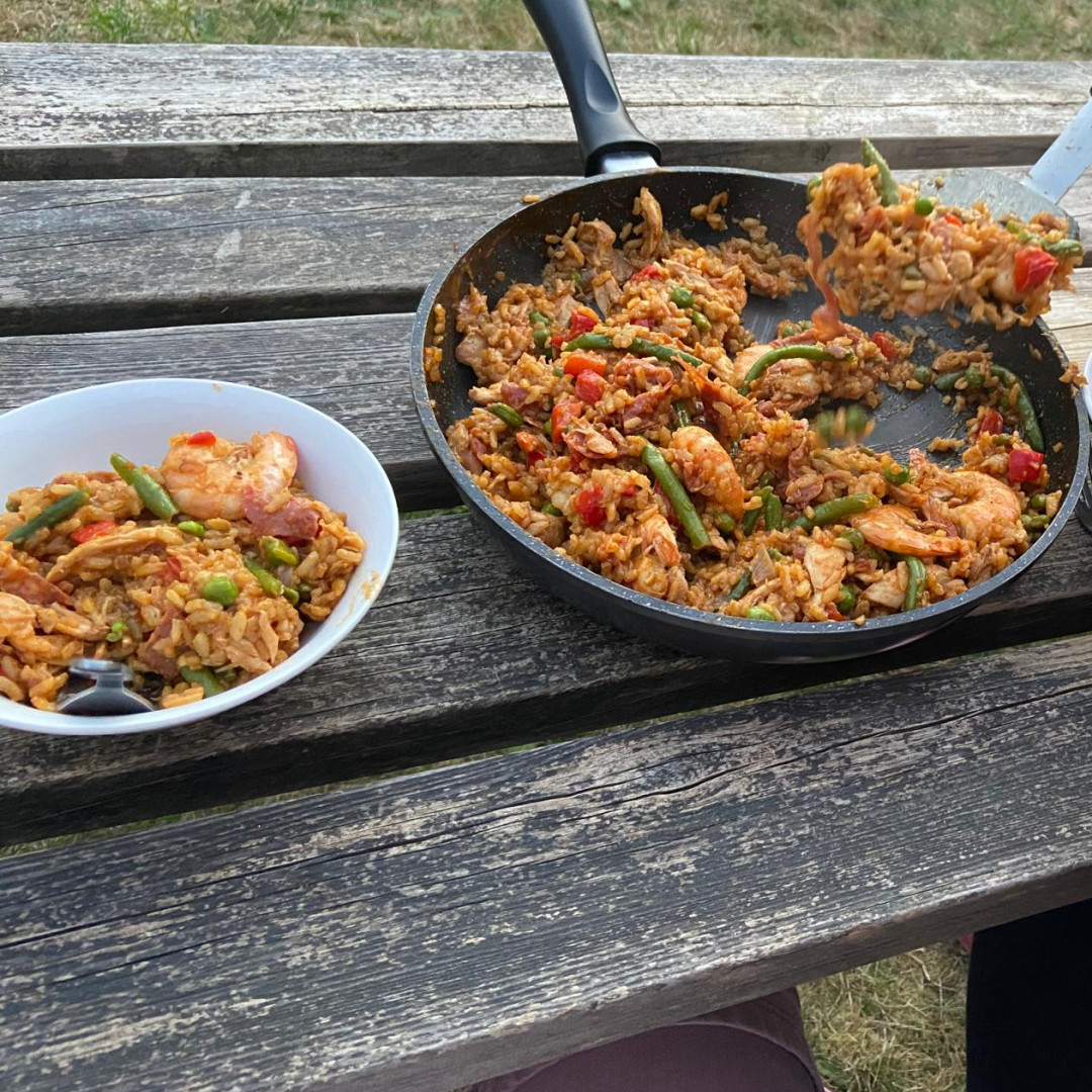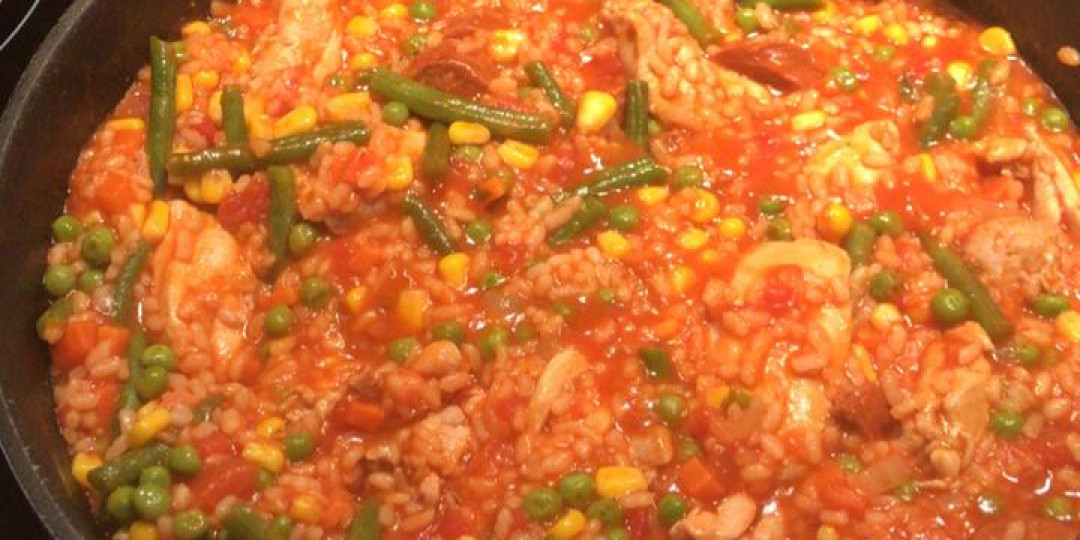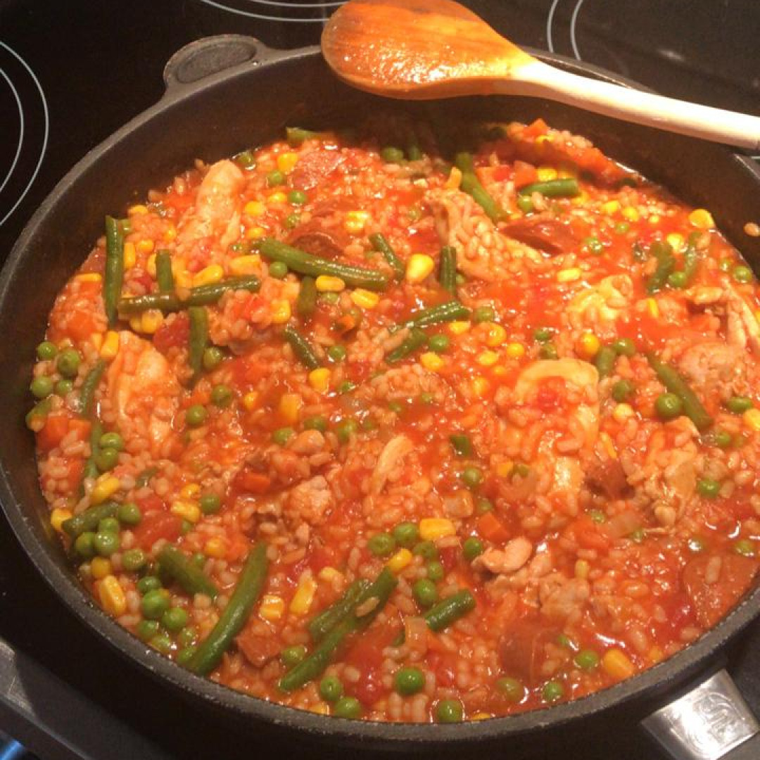 Chicken rice pot with lots of veg, including green beans, tomatoes and sweetcorn