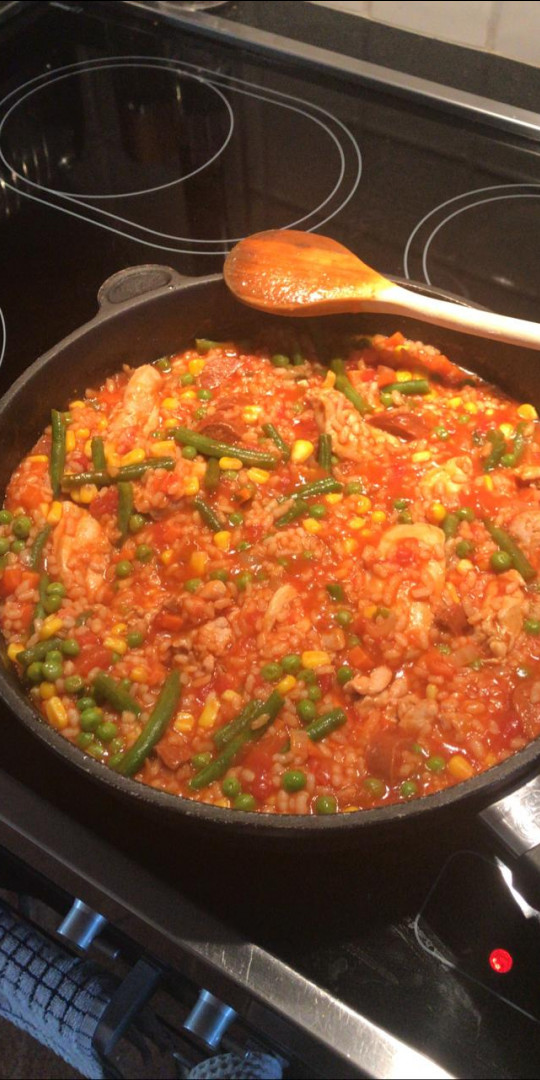 Beans, peas and red pepper paella
