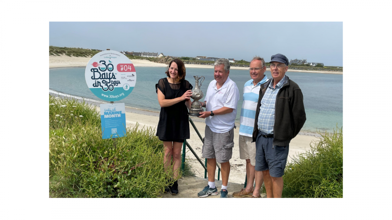 Lizzie Stonebridge, Fundraising Administrator at Les Bourgs Hospice and founder of the 30 bays in 30 Days event has been awarded the RD Leak trophy for being active in the sea, presented by the Health Improvement Commission at Port Soif beach on Tuesday 29th July 2021.