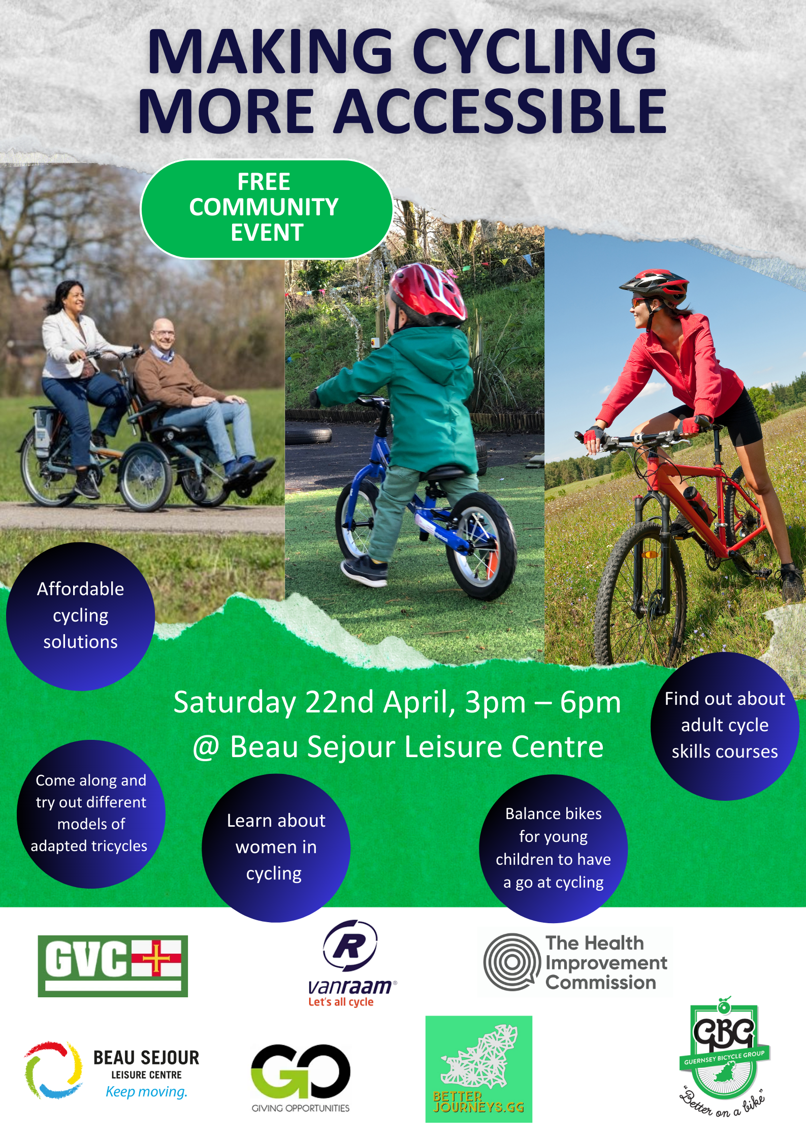Supported by Beau Sejour, in partnership with The Health Improvement Commission, Van Raam Bikes, Ian Brown’s cycle shop, Go Charity, GBG, The Better Journey’s project and the Velo Club, the event takes place on Saturday 22nd April, 3pm – 6pm at Beau Sejour Leisure Centre’s Sir John Loveridge Hall.
