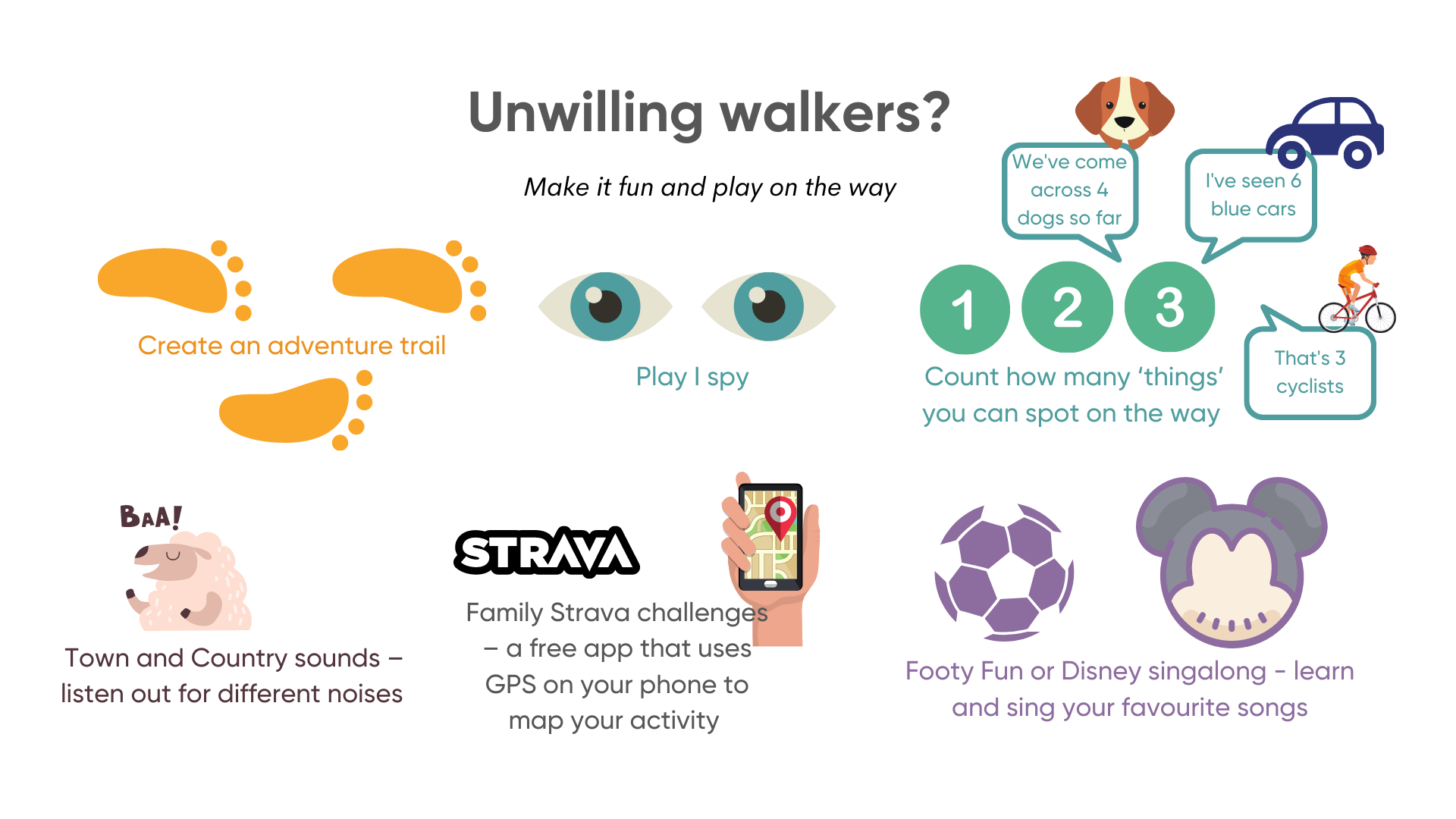 For the Family Strava challenges – the free app that can be downloaded on your phone here – the challenge can be to do your route to school or home/car faster or go further or track your route together as a family