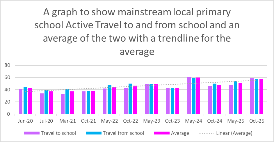 · Active travel to and from primary schools has increased by 10% points in just 12 months since the October 2024 audit, from 48% to 58%. Cycling has increased by 7% points over this period.