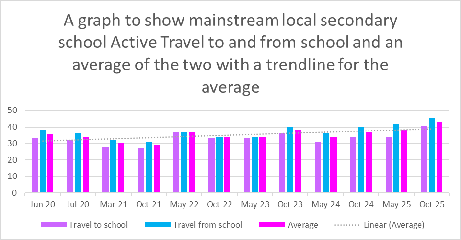 · Active travel to and from secondary schools has increased by 6% points over the same 12-month period since the October 2024 audit, from 37% to 43%. Cycling has increased by 6% over this period.