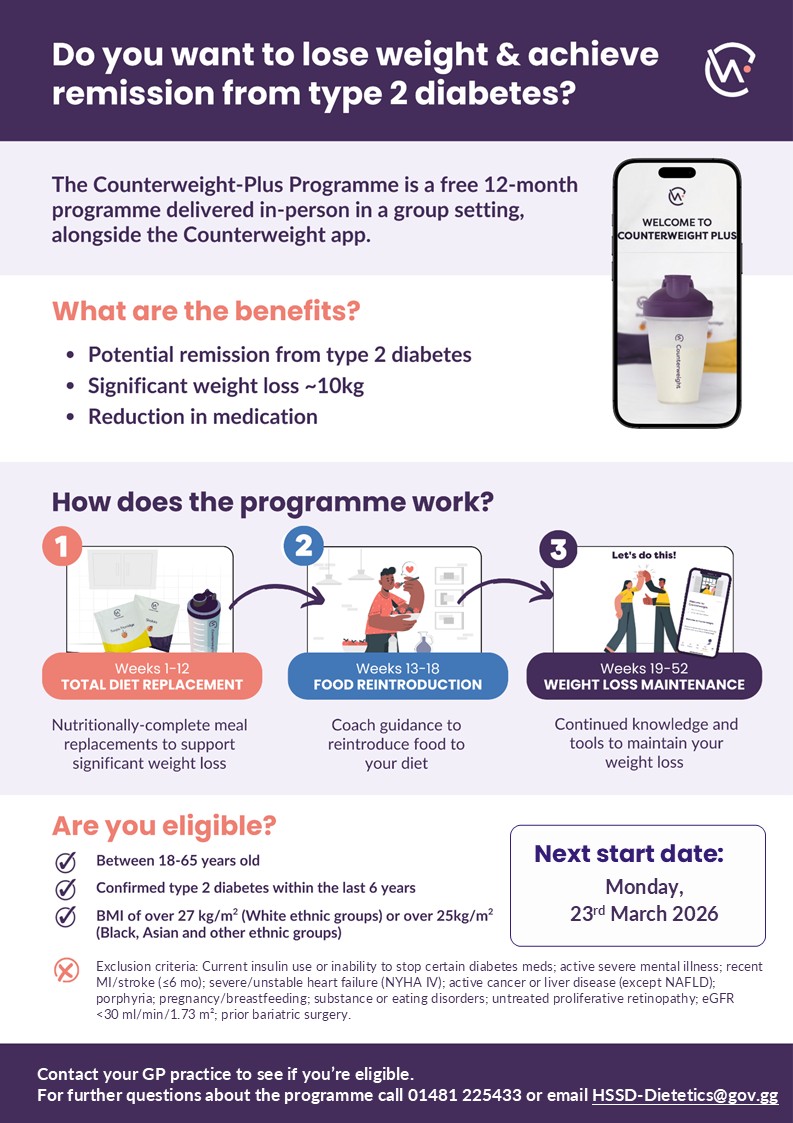 The weight management team are now recruiting people to join a group which aims to help people lose weight and achieve remission of type 2 diabetes, using the Counterweight Plus programme. The programme is FREE to join. See the poster below for programme details and if you think you are eligible, you can ask your GP to refer you today!