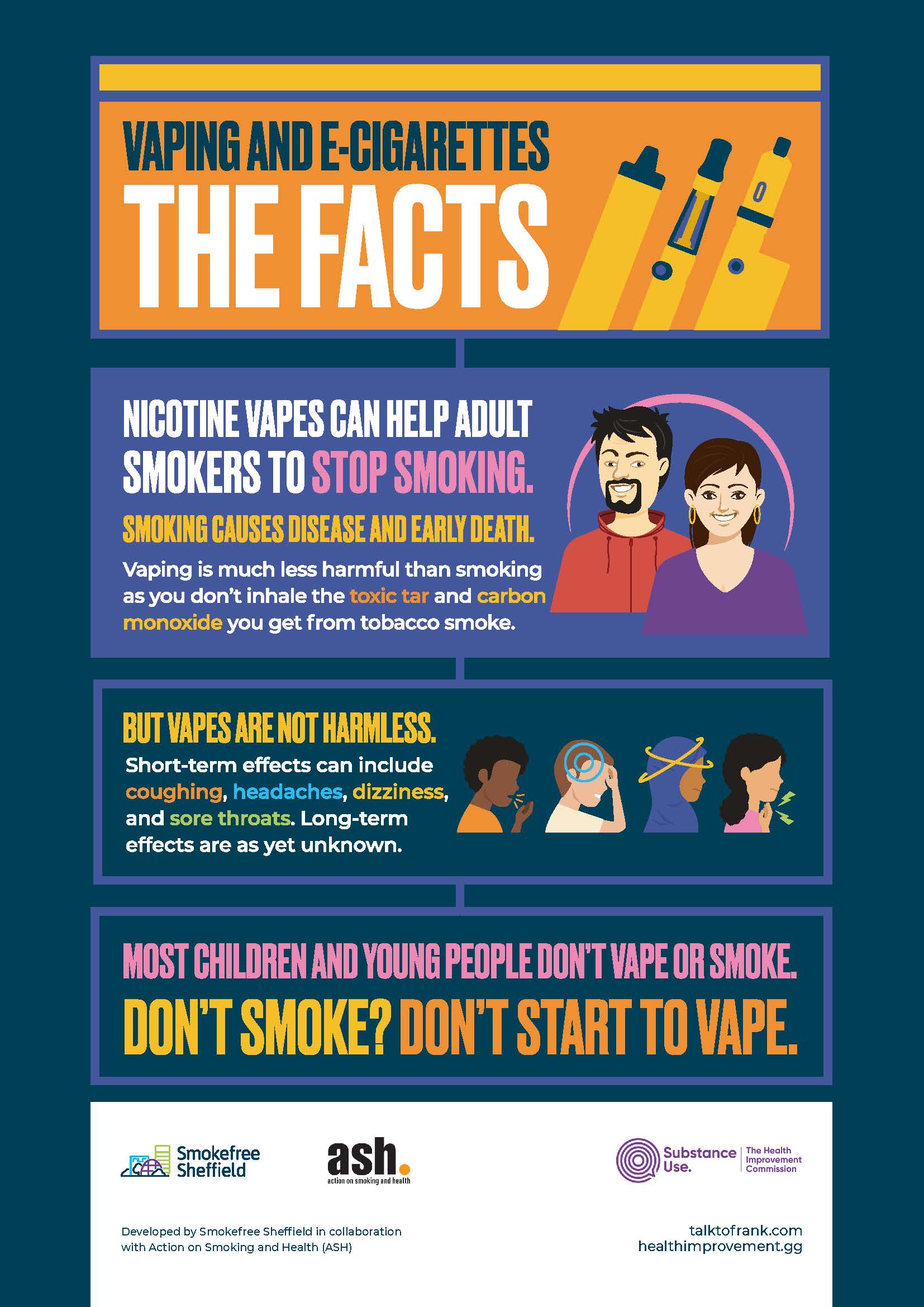 Working with Smokefree Sheffield we have produced a set of resources to help young people and those supporting them to better understand vaping and the potential harms (when not used as an aid to quit smoking). The resources are specific to the Bailiwick of Guernsey and our local laws.